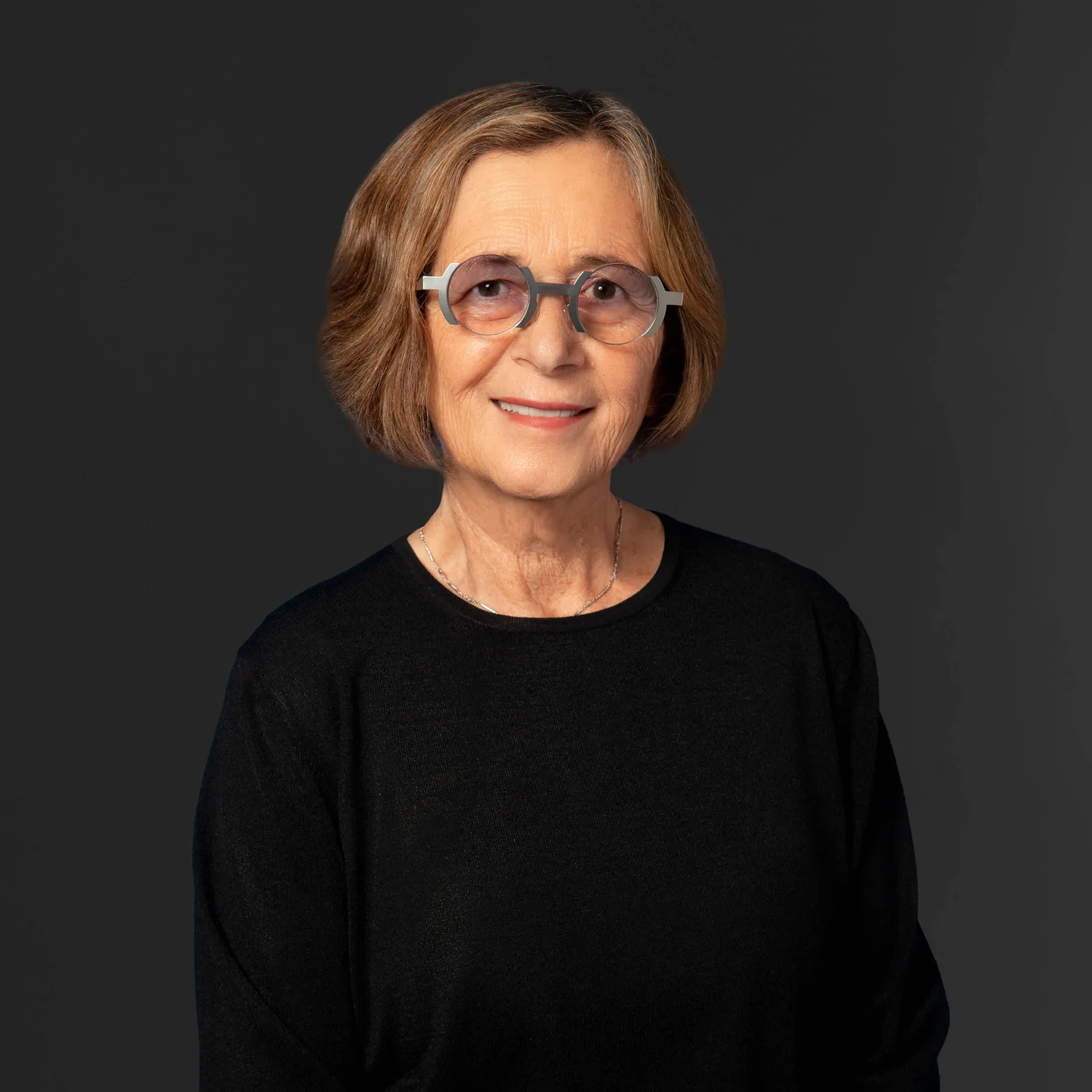 An older woman with short brown hair, wearing round glasses with a unique grey design, a black top, and a delicate necklace, smiling against a dark grey background.