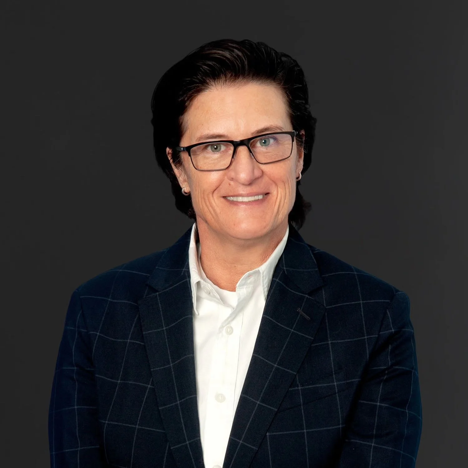 A professional woman with short black hair, glasses, and earrings, wearing a navy blue checked blazer and a white collared shirt, smiling against a dark background.